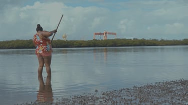 Em continuidade, Nanã (2017), de Rafael Amorim, incorpora elementos ficcionais e documentais para dar voz a uma população submetida aos processos de gentrificação a partir do complexo portuário-industrial de Suape. O filme revela uma resistência que se manifesta na defesa da terra e da comunidade, mostrando que o território é vivido e produzido por aqueles que permanecem e lutam contra o apagamento imposto pelo progresso. Nanã amplia a reflexão sobre a violência do desenvolvimento, destacando a potência das ações coletivas e dos vínculos que mantêm o território vivo.